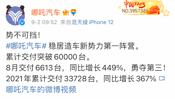 哪吒8月交付了6613台,同比增长449%,超过了蔚来的销量。因此,它在官方传播中这样描述:势不可挡,哪吒汽车稳居造车新势力第一阵营。
