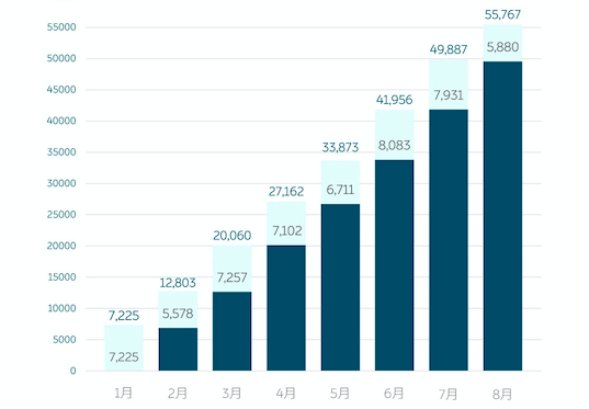 因为这是它自量产以来所有月份的累计量,不是今年1-8月的累计量。比如,今年1月的柱图上已有10,213的累计量,这不可能是1月销量,而是包含了截止到2020年12月的8699辆。