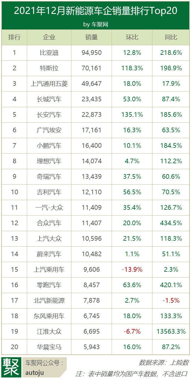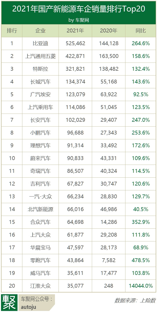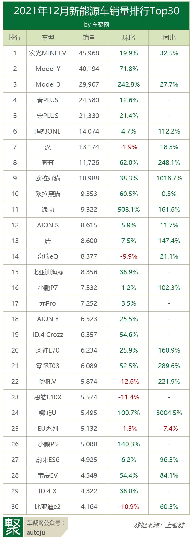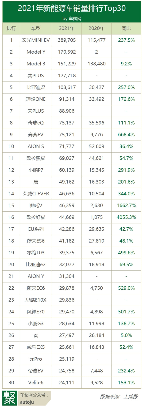 2021新能源榜单:比亚迪53万辆夺冠,宏光EV月销超3万最畅销 | 聚闻