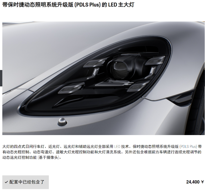 最大的遗憾是没有选带保时捷动态照明系统升级版 (PDLS Plus) 的 LED 主大灯,毕竟标配的氙气大灯只有1个日间行车灯的光源,而LED大灯内部是4个光源,样式是与新款的Panamera相近的,不管白天还是晚上都与标配的大灯有明显的区别,且辨识度很高,虽然选配价格要24400元,但其实花的还是蛮值的。