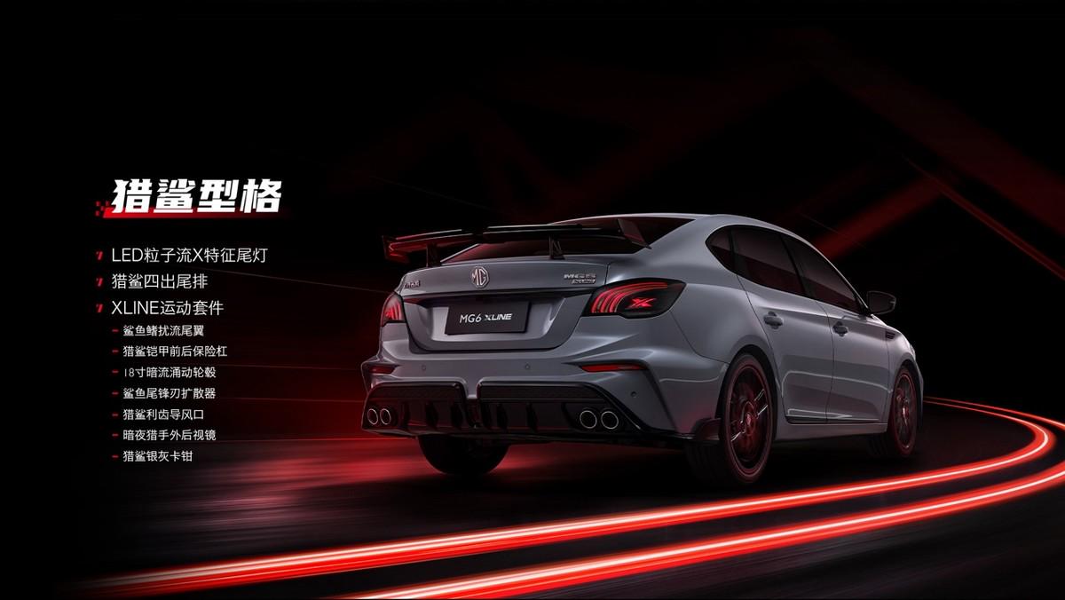 MG6 XLINE新猎鲨格栅前脸的造型灵感源自“深海猎手”鲨鱼,锐利的线条与型面使正面观感更凶悍,竖向线条和形似锋利鲨鱼的视觉效果,性能范儿十足,加上LED粒子流X特征尾灯、仿生学扰流尾翼、导风风刃扩散器和四出尾排造型,以及18寸熏黑运动轮毂、熏黑后视镜等配置,让整车更加凶猛且极具力量感。专属的低饱和度水泥灰配色,则赋予MG6 XLINE别具一格的高级感与战斗气息。