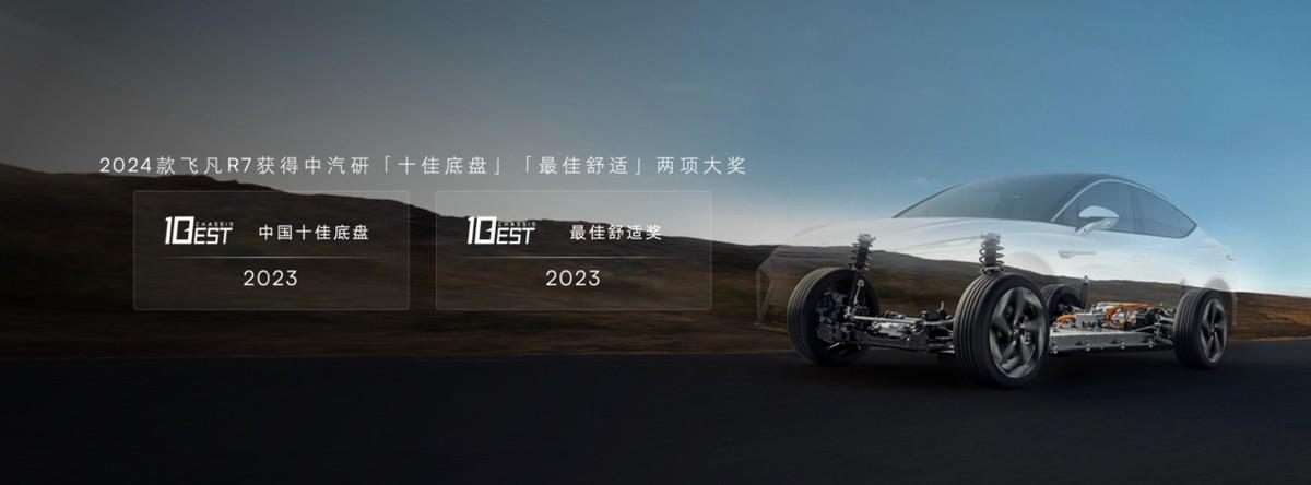 在动态舒适方面,新款R7首发研发价值10个亿的飞凡湾域驾驶系统。它融入了航空三轴技术理念,让三电域与车身域更好联控。日常行驶中,它通过行业罕有驾驶性能标定,实现动力4K级线性输出、纯电超线性舒适刹车、以及更精准的转向反馈。在乘坐体感上,它让新款R7在市区频繁加速/制动、山路过弯、高速并线等场景下,拥有同级卓越的平顺流畅表现。此外,新款R7凭借行业领先的横风抑制功能,实现车辆更稳控制。整车的全新舒适调校,令新款R7荣获中汽研2023年“中国十佳底盘”和“最佳舒适奖”。