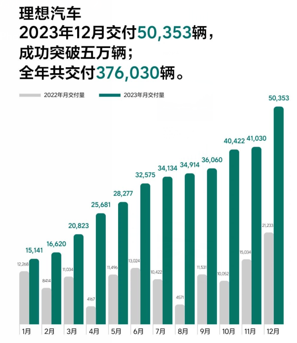 理想12月成功完成月交付5万辆的挑战,交付50,353辆,同比增长137.1%。领先优势依旧明显:销量比排名第二、第三的合计量还要多。