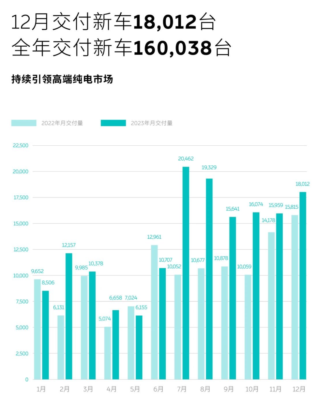 蔚来12月以18,012辆的交付排名新势力第五位,同比增长13.9%,环比提升12.9%。2023全年,蔚来共交付新车160,038辆,同比增长30.7%,排名第二位,仅低于理想;自交付以来累计交付新车449,594辆。