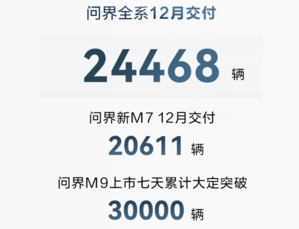 问界新M7单月交付量突破两万辆——12月交付20,611辆,累计交付量为48,552辆。据悉问界新M7累计大定已突破12万辆,这意味着还有约7.2万辆的大定待转化。含“华“量更高的问界M9,已于2023年12月26日正式上市,上市七天累计大定突破3万辆。