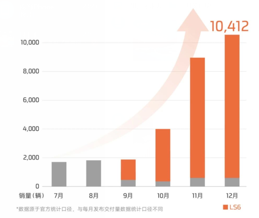 智己汽车近几月销量高速攀升:10月突破4000辆,11月攀升至8000辆,12月再破万至10,412辆。功臣是智己LS6,12月销量为9,878辆。