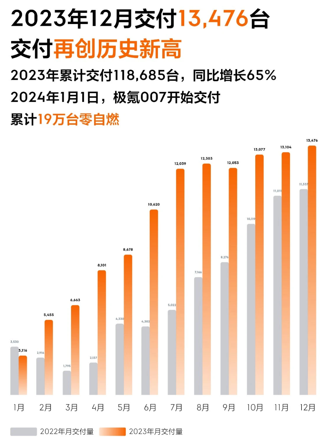 极氪排名第六位,12月新车交付13,476辆,同比增长18.9%,环比提升2.8%;2023年共交付118,685辆,同比增长65%。