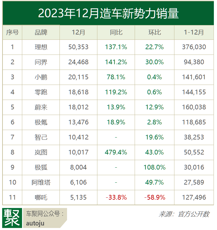 12月新势力:理想破5万,问界超小鹏夺第二、哪吒垫底 | 聚数