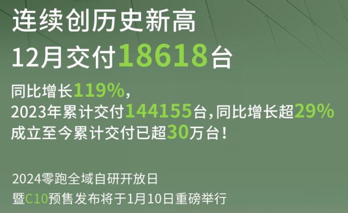2024年1月10日,零跑将举办全域自研开放日,届时其全球化车型C10将开启预售,按此前计划新车在一季度内上市交付。另外,零跑C16也会在2024年中推出。