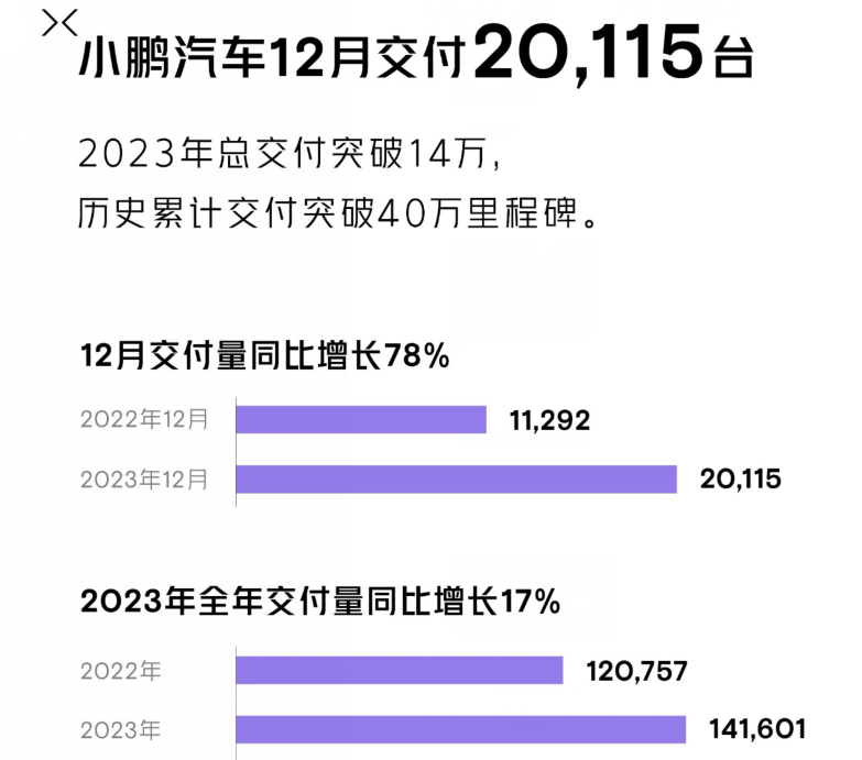 小鹏位居第三,12月新车交付20,115辆,同比大增78.1%,环比却微增0.4%,被问界超过。2023年全年交付14.16万辆,同比增长17.3%,位居第四;自交付以来累计交付量超40万辆——400,311辆。