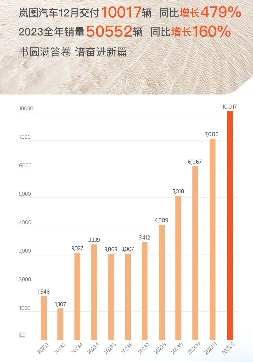 岚图12月销量正如预期:新车交付10,017辆,同比增长479%,全年共交付50,552辆,同比增长160%。