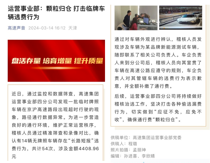 3月14日,公众号《高速声音》发表题为《运营事业部:颗粒归仓 打击临牌车辆逃费行为》的文章。作者是:天津高速公路集团有限公司。
