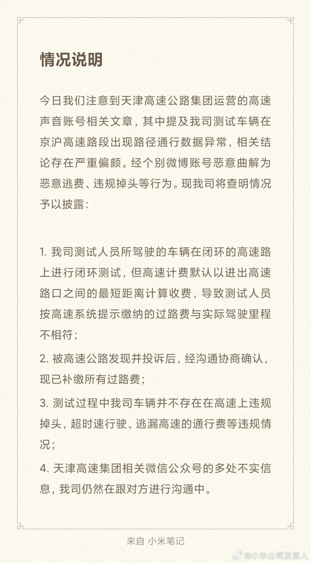▎天津高速的公众号文章多处不实,小米在沟通中。