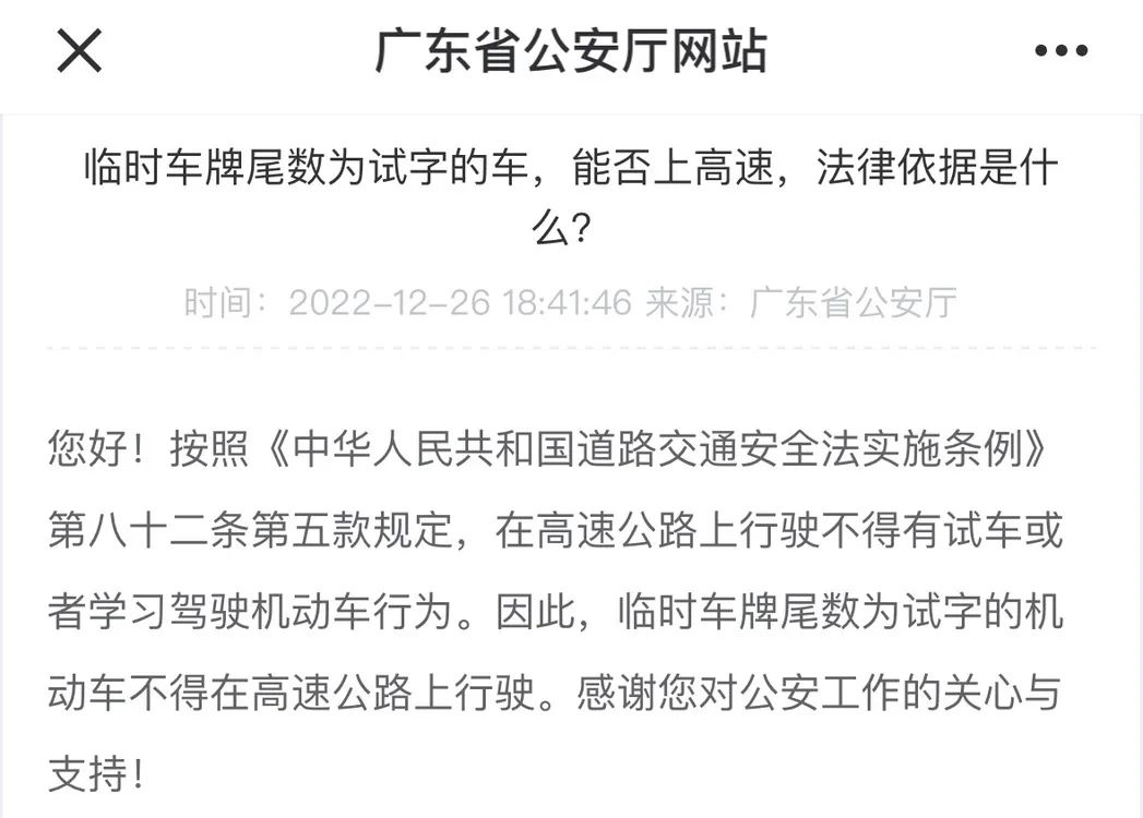 司法实践中,广东省公安厅在2022年12月26日的公开问答中,明确指出:临时车牌尾号为试字的机动车不得在高速公路上行驶。