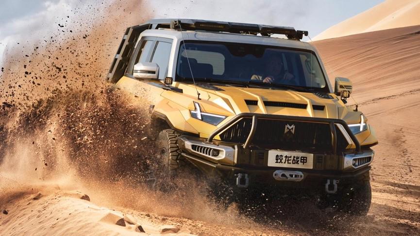 作为面向深度越野用户和专业玩家打造的一款全域机动的豪华电动越野座驾,猛士917蛟龙战甲沿袭了猛士家族“雄魂”设计,将军武风格与中国龙元素相结合,形成“蛟龙战甲”独有的设计创意。沙漠风暴黄军事涂装,搭配银顶撞色,高级感拉满;威严的直瀑式中网布局、威猛的龙牙仿生造型、威风的龙鳞式机盖通风罩,将前脸战斗值拉满,破风而行,一往无前;全封闭式旋翼锻造轮毂,借鉴军车设计,搭配前后宽体轮眉,宛如蛟龙出海,破浪逐波。