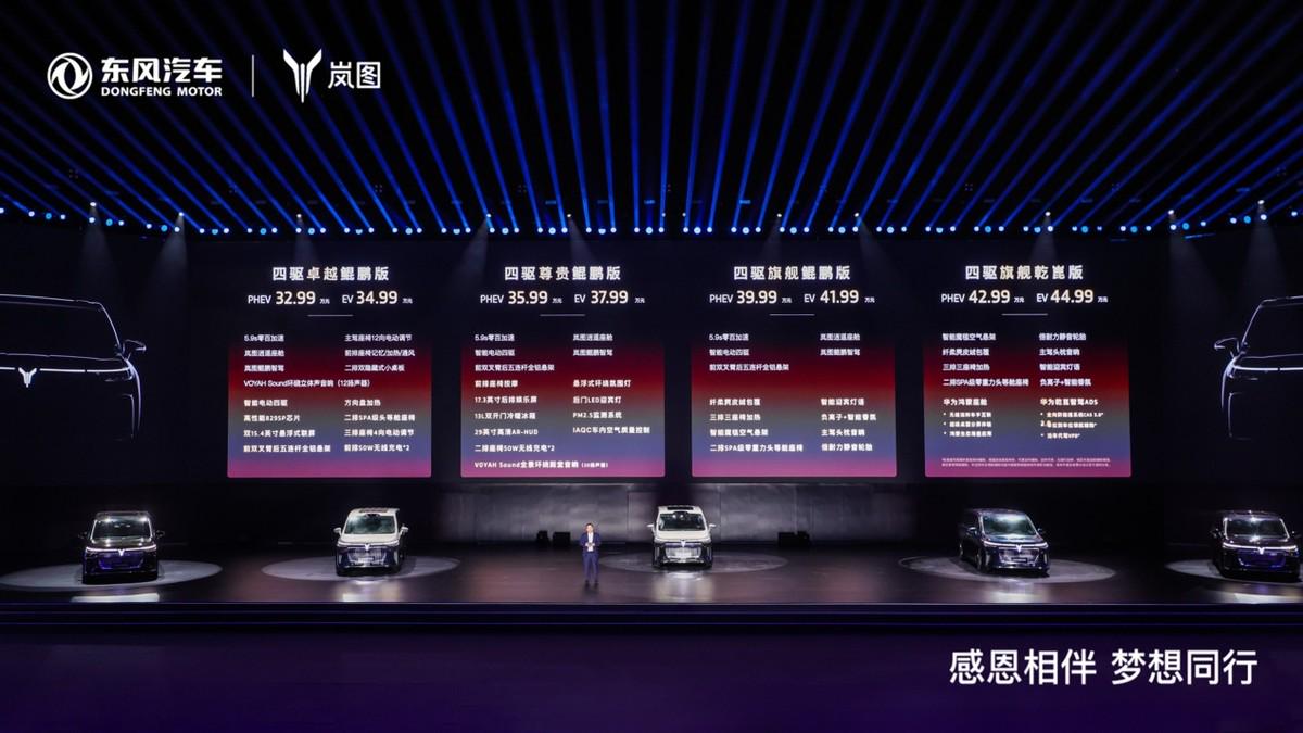9月19日,以“感恩相伴 梦想同行”为主题的东风汽车感恩6000万用户相伴暨全新岚图梦想家上市发布会于武汉成功举办,全新岚图梦想家正式上市并公布价格,其中,全新岚图梦想家四驱卓越鲲鹏版PHEV 32.99万元、EV 34.99万元;全新岚图梦想家四驱尊贵鲲鹏版PHEV 35.99万元、EV 37.99万元;全新岚图梦想家四驱旗舰鲲鹏版PHEV 39.99万元、EV 41.99万元;全新岚图梦想家四驱旗舰乾崑版PHEV 42.99万元、EV 44.99万元。